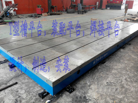我公司為保定客戶生產(chǎn)的T型槽焊接平臺,2件2500*4000mm的T型槽平臺,拼接成2500*8000mm的焊接裝配平臺.表面帶有刻度線,間距200*200mm。應(yīng)客戶要求在平臺周邊間距250mm均布M20的螺栓孔40個(gè)。